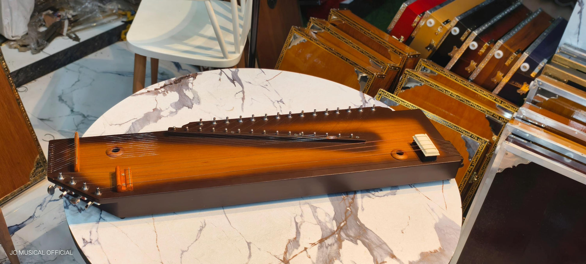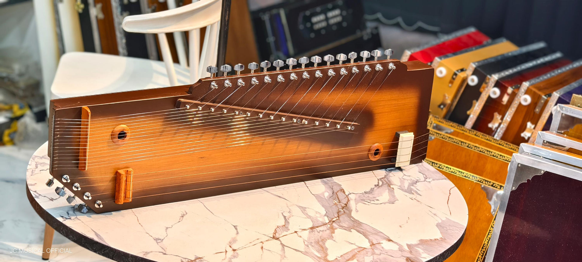 This "Swarmandal" is a combination of two Indian instruments. The first is a tanpura, which can be tuned to female or male range and is strung with common wound guitar strings. The second is a 15-string swarmandal string with plain steel guitar strings and a variety of tuning options. Both instruments are built on the same sound box. It is fitted with all modern gear tuners for easy tuning.
