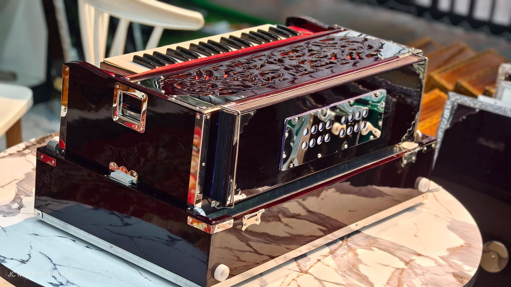 -A harmonium, also called a "melodeon", "reed organ" or "pump organ", is a keyboard instrument that is a lot like an organ. It makes sound by blowing air through reeds, which are tuned to different pitches to make musical notes.This is joined to a mechanism which operates a bellows, sending air to the reeds.