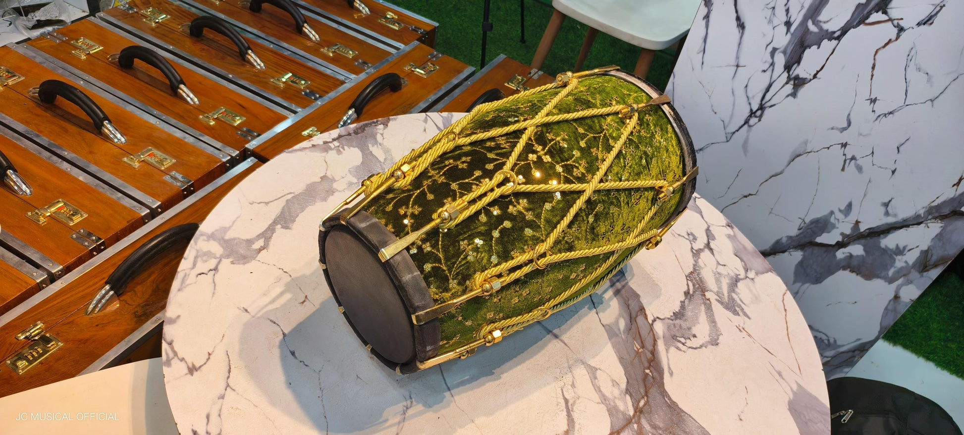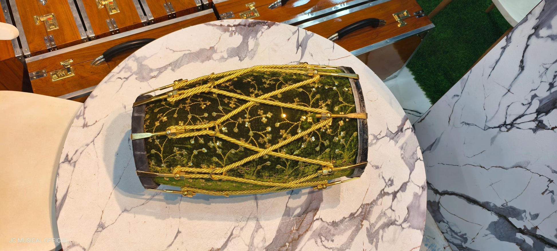 Sheesham Wood professional Dholak: Green Velvet design jari work, Nut Bolt Tuning