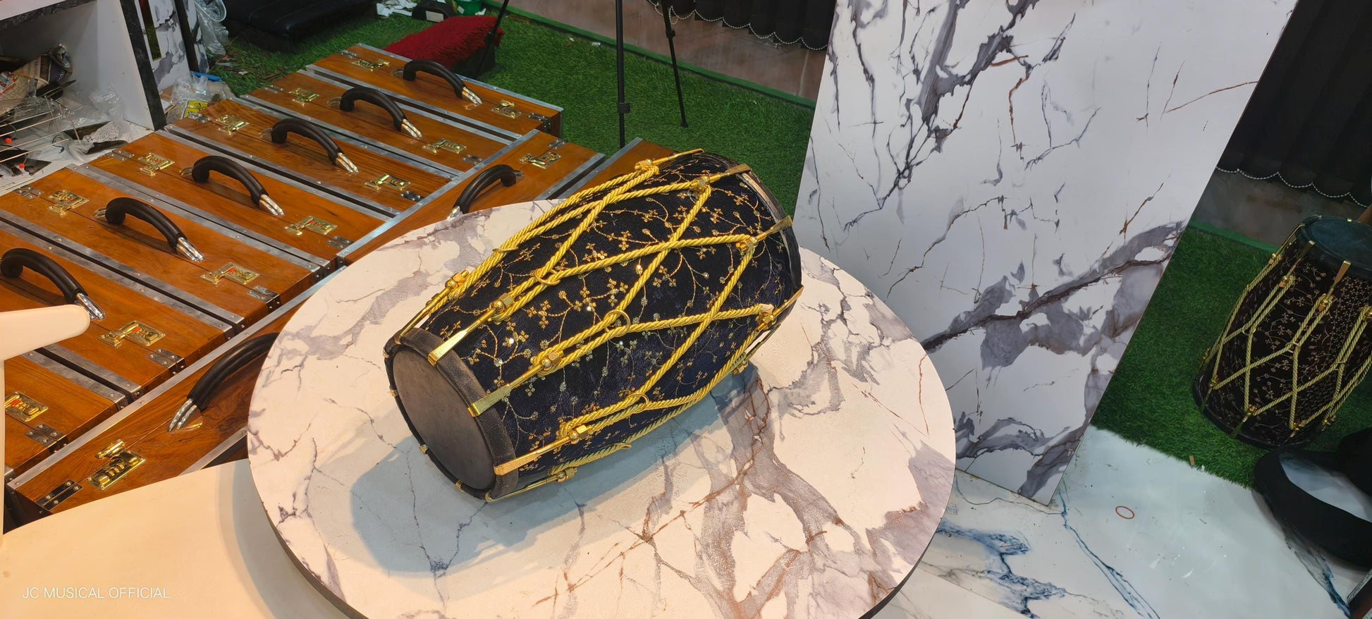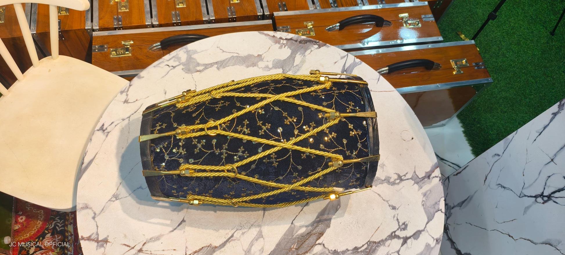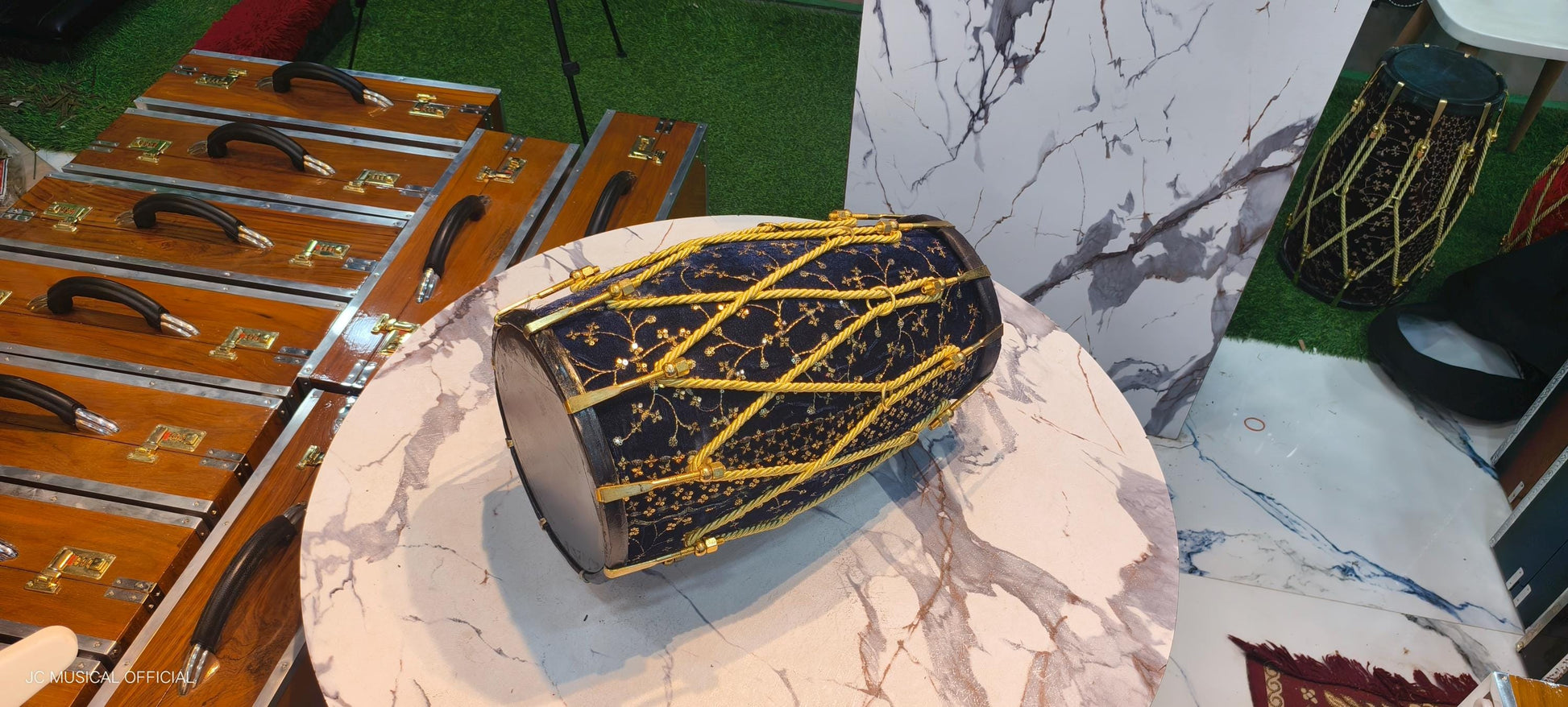 Sheesham Wood professional Dholak: Navy Blue Velvet jari work. nut bolt tuning system