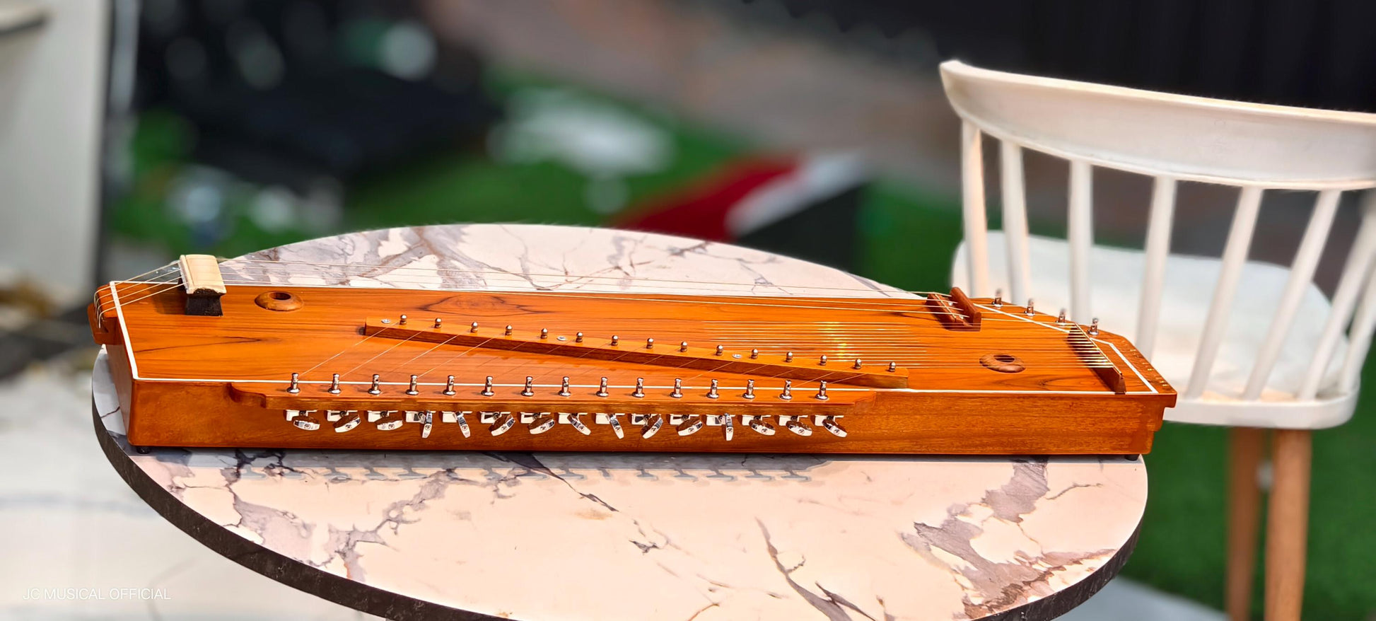 This "Swarmandal" is a combination of two Indian instruments. The first is a tanpura, which can be tuned to female or male range and is strung with common wound guitar strings. The second is a 15-string swarmandal string with plain steel guitar strings and a variety of tuning options. Both instruments are built on the same sound box. It is fitted with all modern gear tuners for easy tuning.